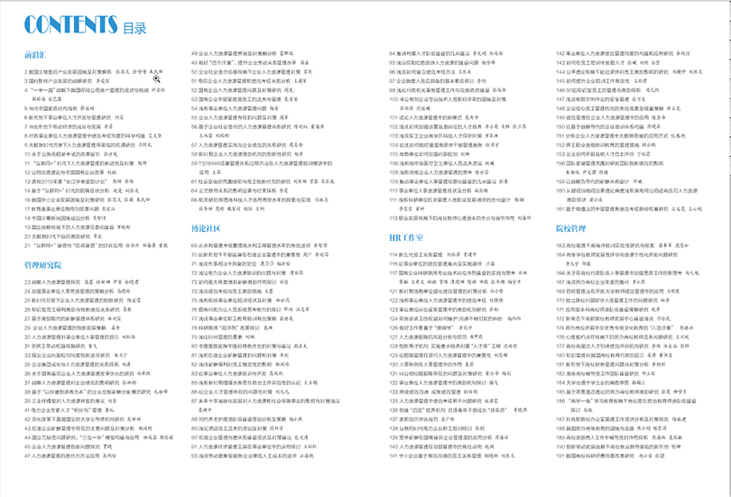 主要栏目:管理研究院、前沿汇、绩效•薪酬、人才开发、论坛、案例、实务、资讯、高校管理、医院管理、教学与保障、管理研究、管理实务、组织管理等。