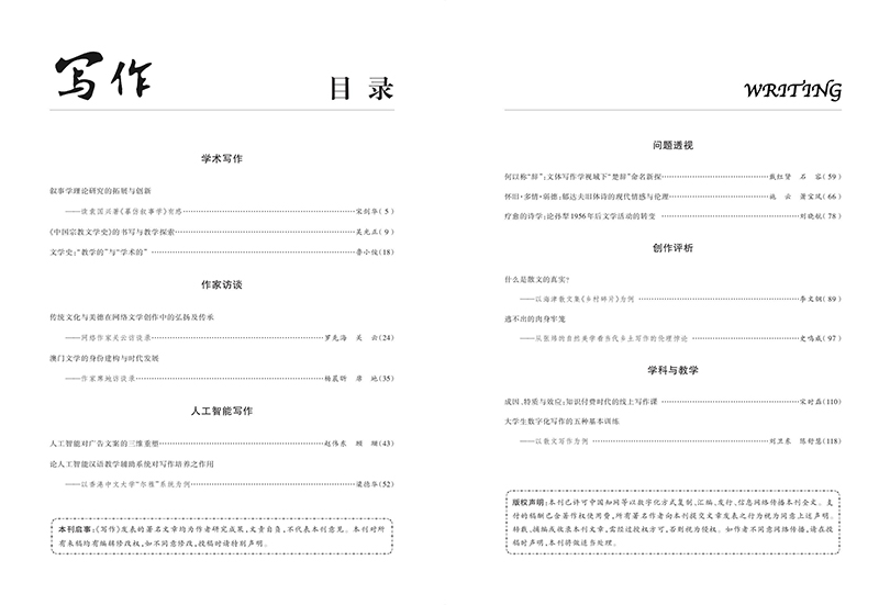 总之,作为一本专注于写作领域的杂志不仅致力于传授写作技巧,还通过拓展创作思路和提供文学评论,为读者提供创作灵感和阅读体验。它是写作爱好者的必备读物,也是广大文学爱好者不可多得的参考资料。