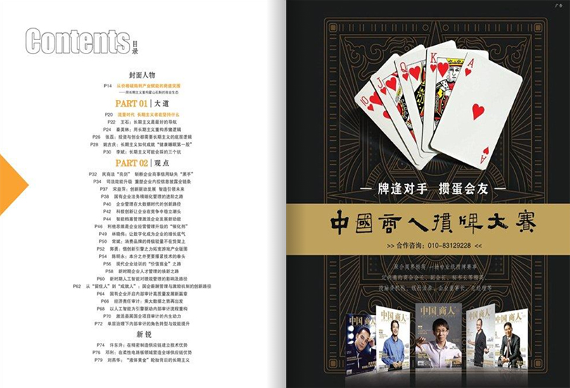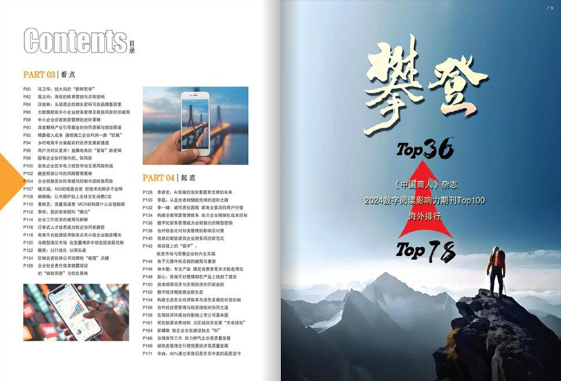 杂志内容涵盖了广泛的商业领域,包括制造业、科技、金融、零售、房地产等,不仅报道了中国商界的成功案例和经验,也关注了全球商业趋势和创新发展。每一期杂志都邀请到了业内专家、企业家和政府官员,就当前的商业热点和挑战进行深入分析和探讨。